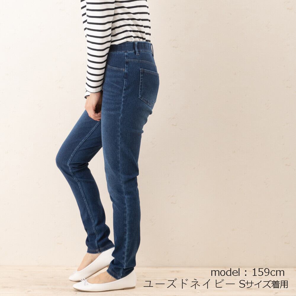 見た目はデニムなのに縦横自在に伸びて動きやすい。股上は他社より深めに作り、背中が見えにくくウエストがゴワゴワしないように平ゴムを使用!以前のレギパンより進化しています。フィット感のあるスキニーシルエットが女性らしい美脚を演出します。よく伸びるだけではなく、戻る力もしっかりあり心地よいフィット感が癖になりますよ。 《スタッフのコメント》楽にはけて動きやすくすっきりと見えました。股上が深くはき心地が良かったです。股下も長めのデザインでした。ユーズド加工と肉厚な素材が脚のラインを拾いすぎず、すっきりみせてくれます。カラーは定番の3色展開です。オールシーズンはいて頂けます。